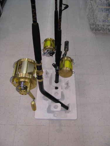This unique rack holds nine rods and reels or four bent butt rods and five standard.To modify rack for bent butt simply remove wedge piece as needed.Size of rack is 24"x16"x9" center to center of holes for bent butt rods are 11"
