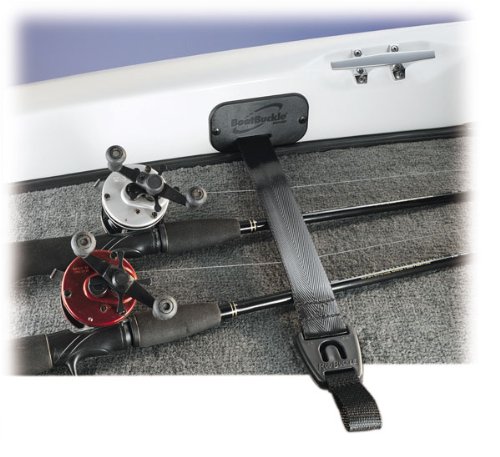 BoatBuckle Rodbuckl Gunwale Mount. Designed by fishermen for fishermen. The RodBuckle Retractable Rod Hold-Down System is the most attractive and functional rod hold-down system on the market for deck style fishing boats. The self-retracting polyester strap extends a full 24" and securely locks into position on the deck. The PVC extrusion coated strap grips rods and resists hook penetration when not in use, it neatly retracts out of the way. Easy installation with included mounting template. Get yours today! BoatBuckle Rodbuckle Gunwale Mount